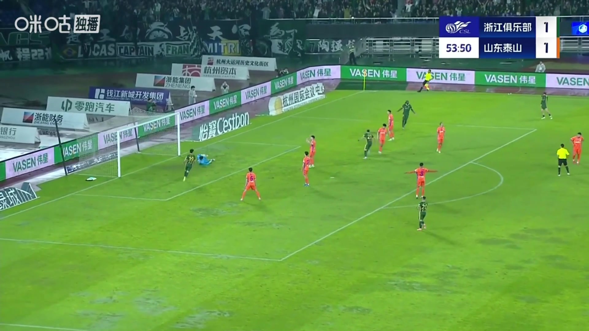 王大雷无可奈何奥乌苏转身小角度爆射破门浙江队反超比分